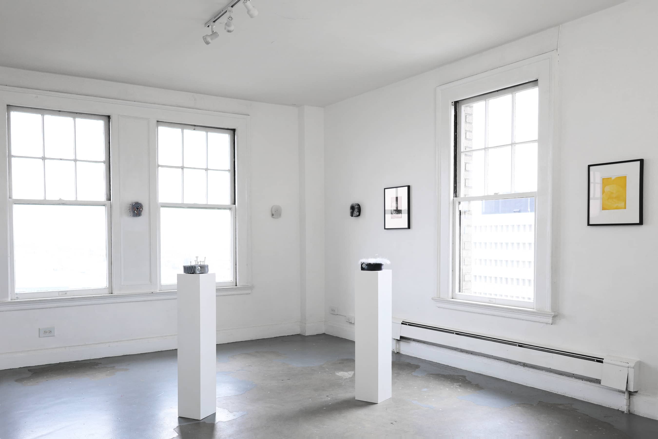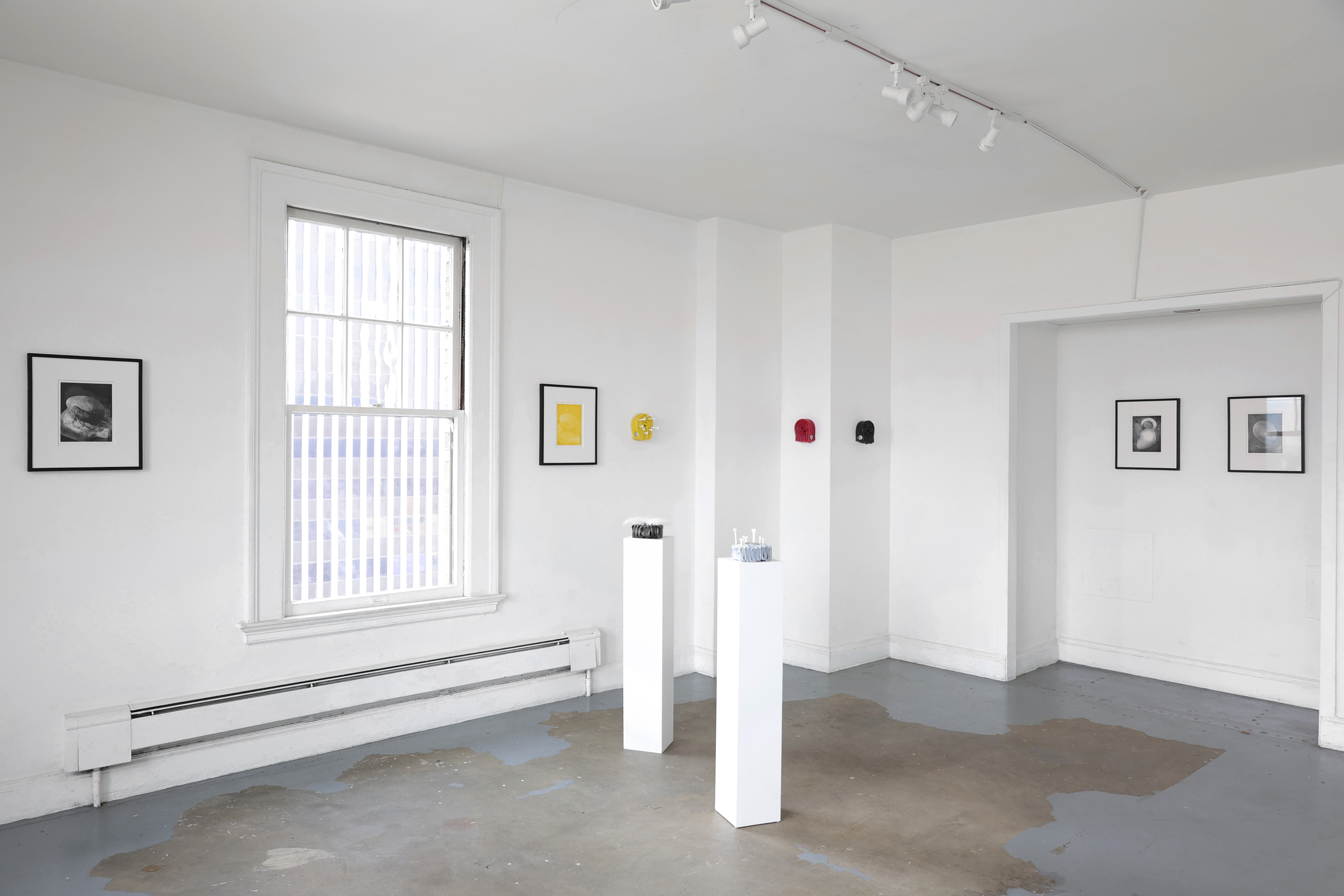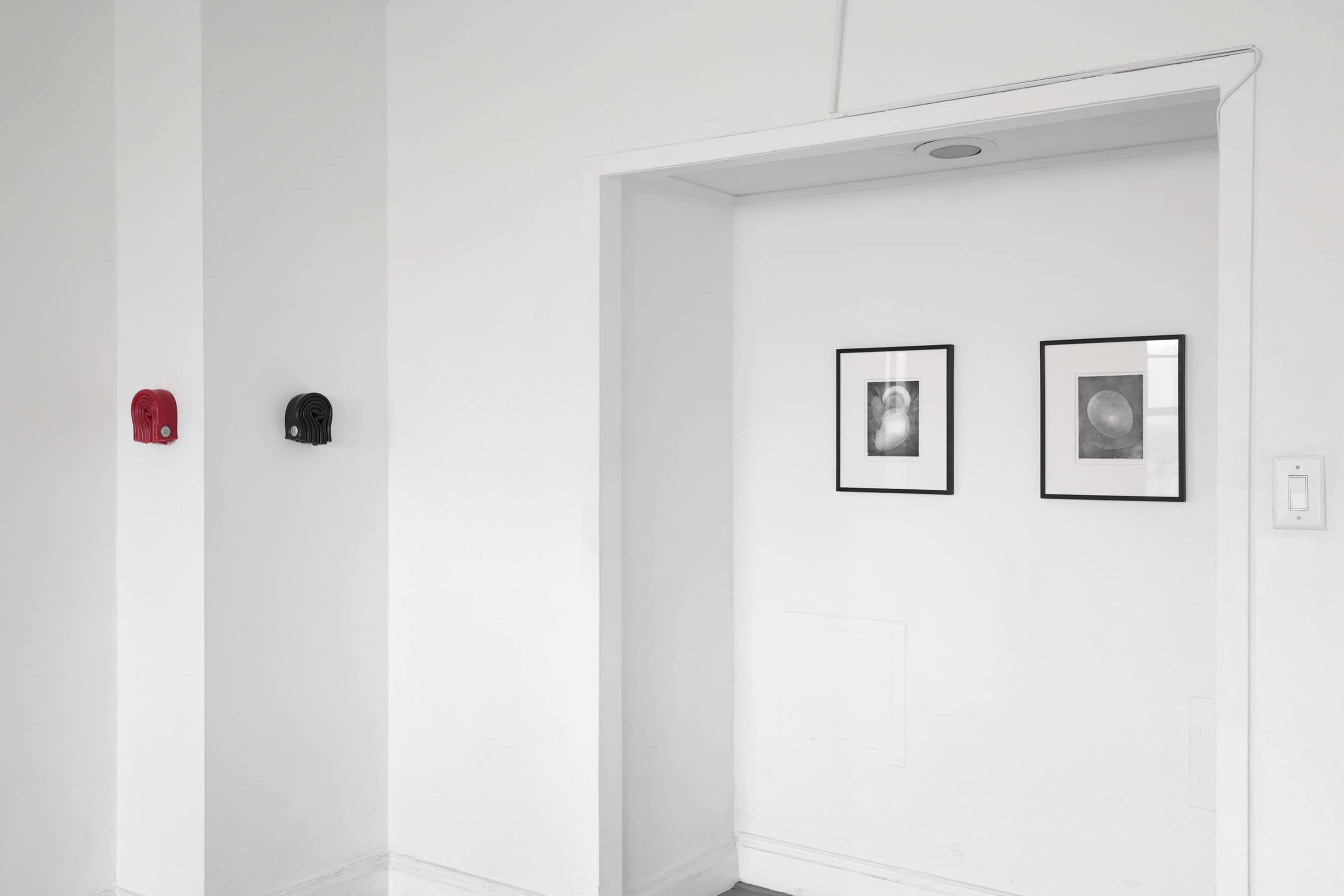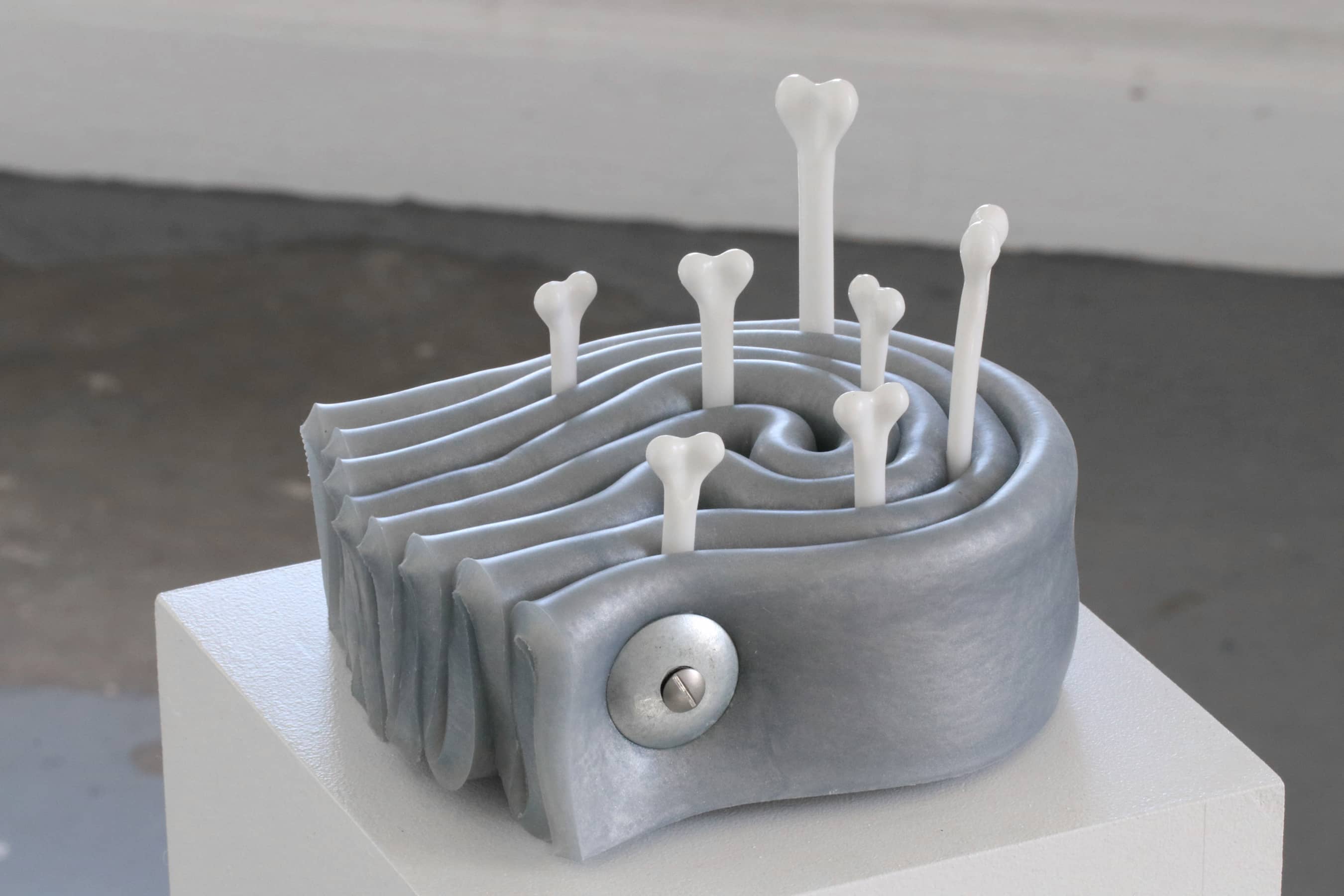 In the Unnamed Charm series, folded and curled colored silicone sheets—in black, silver, yellow and reds—are held together with steel hardware, creating small bijou-like, tense objects that might fit in one’s hand. Installed throughout the room, each one has its own persona. Some are sprouting synthetic hair, adding a soft-edged aura to the hard edges of the boldly colored silicone. Others have small plastic bones protruding from their crevices, or red-tipped pins stuck into the material. The lines of the parallel folds form vague question marks.