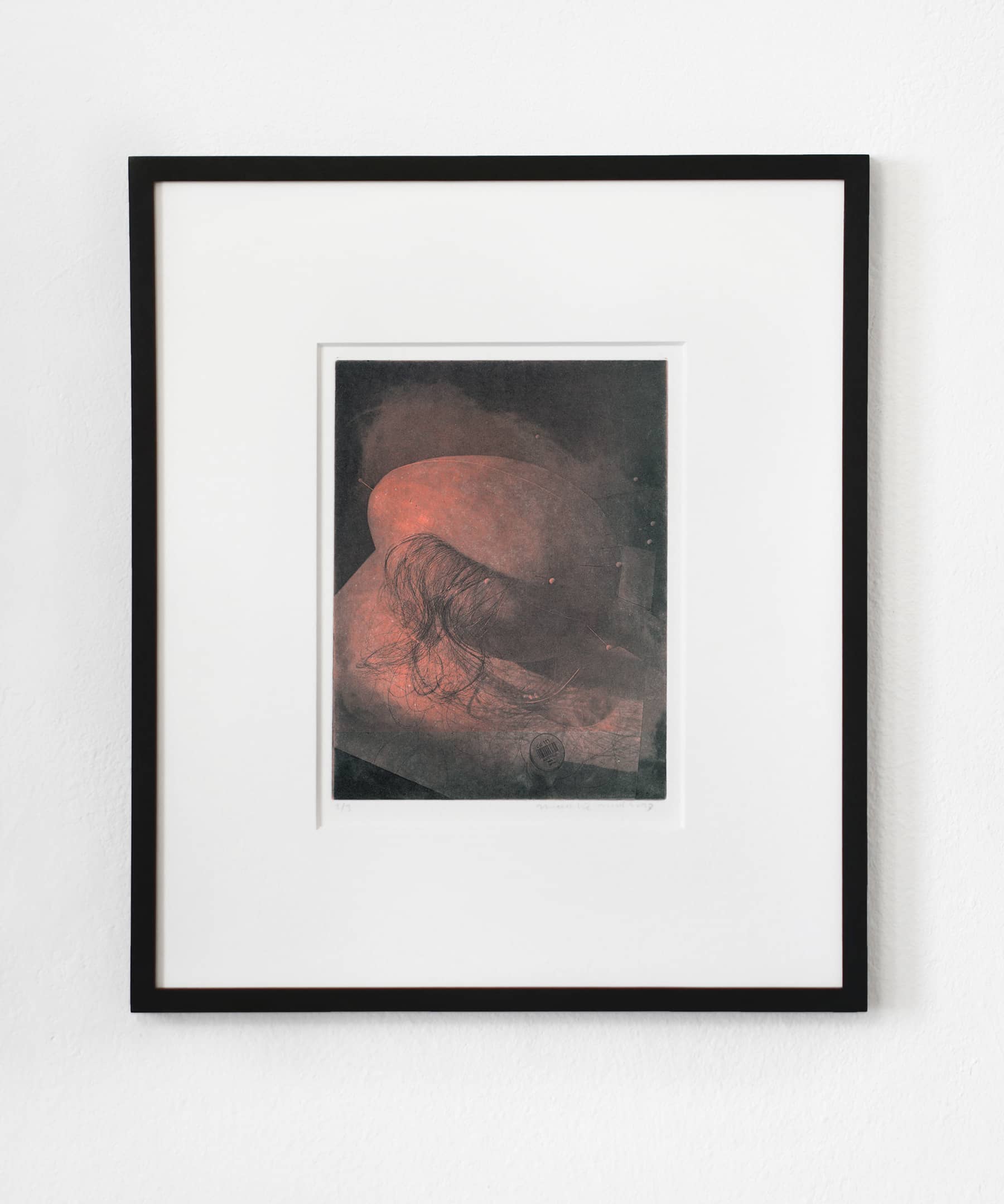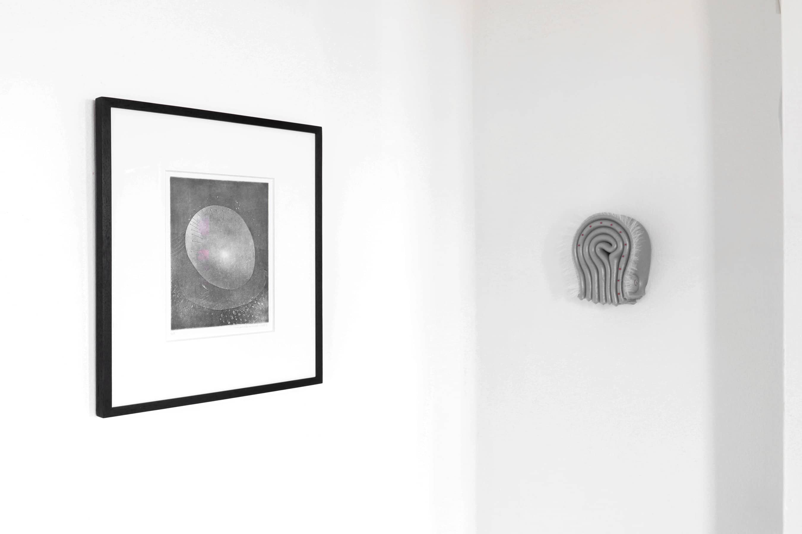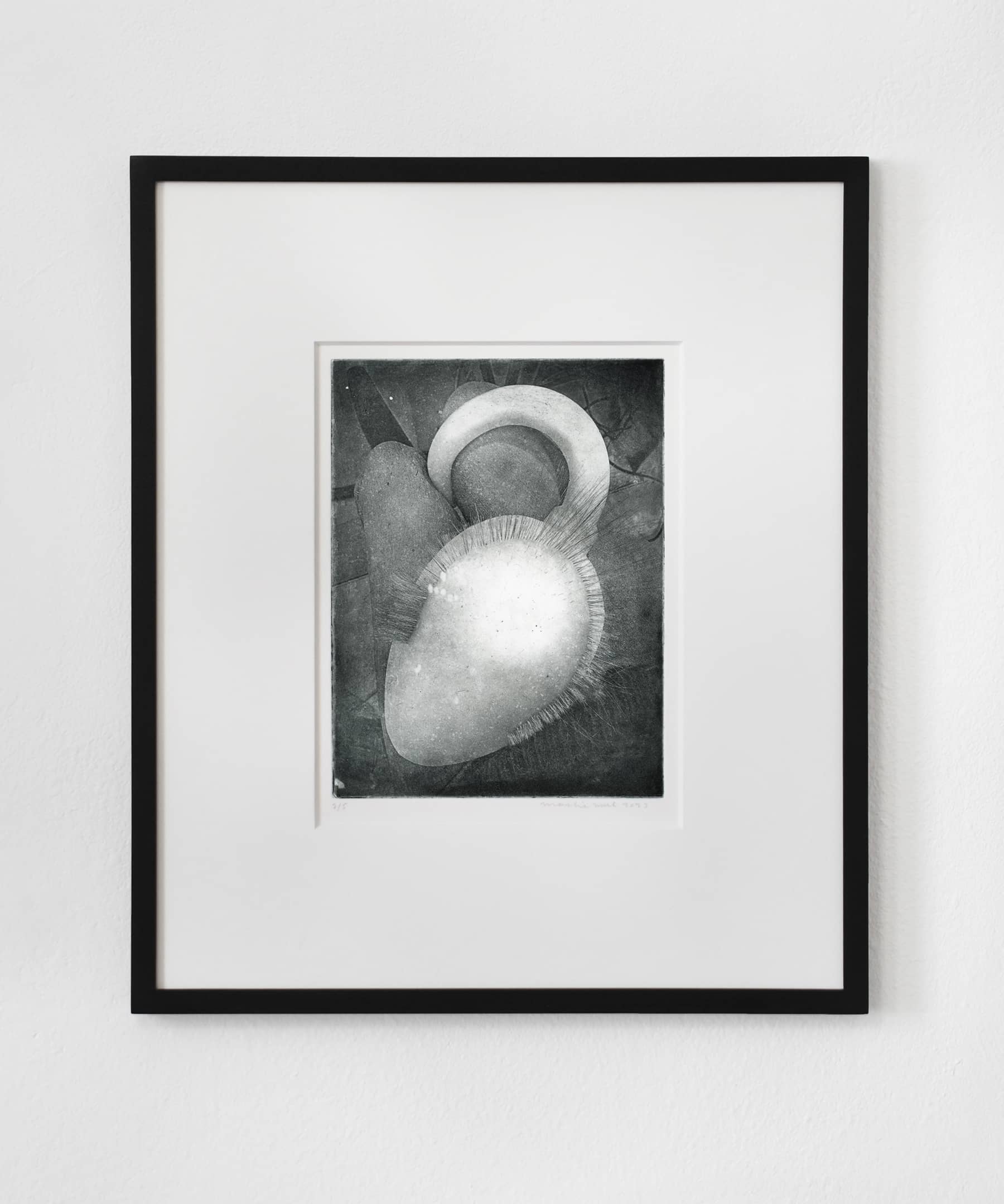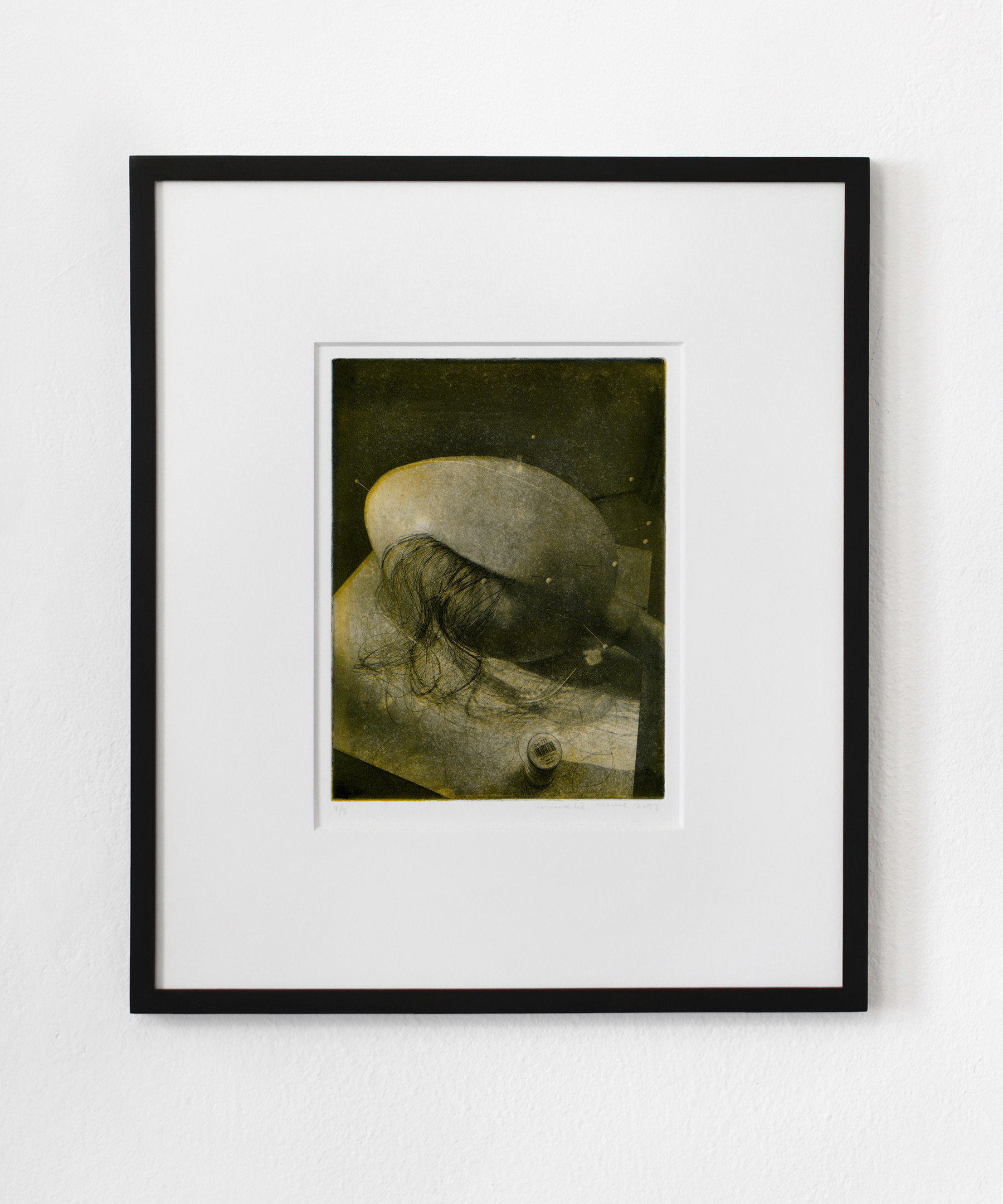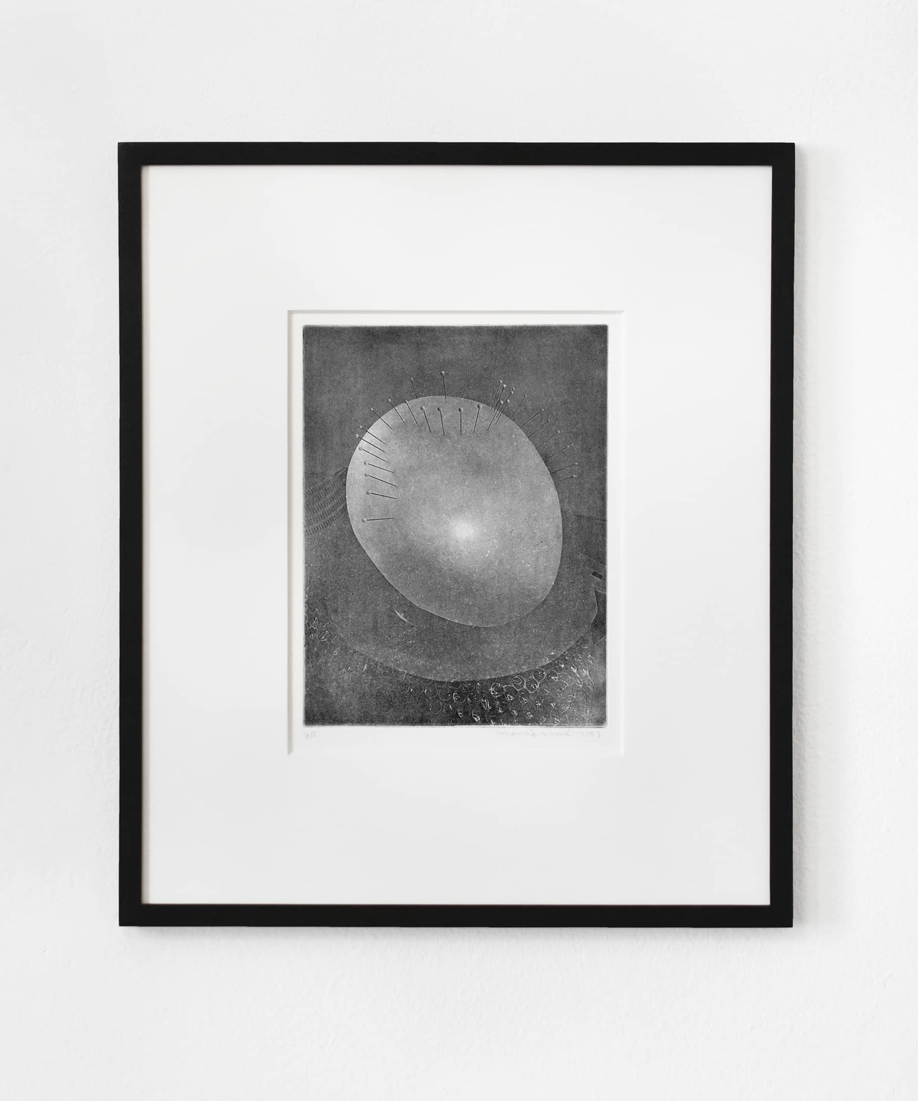 The Unnamed (Scalps) prints are made using the photo-etching technique photogravure, which was first developed in the 19th century. Shadowy images of egg-like shapes with pins and hairs can be made out through a kind of haziness of texture that emerges from both the images and the printmaking technique. These photos were taken while Mul was producing works for the 2021 exhibition, Sperms Going to a Fashion Show. The objects appear as though stalled in a process of anthropomorphization, their hairstyles and identities not quite finished.