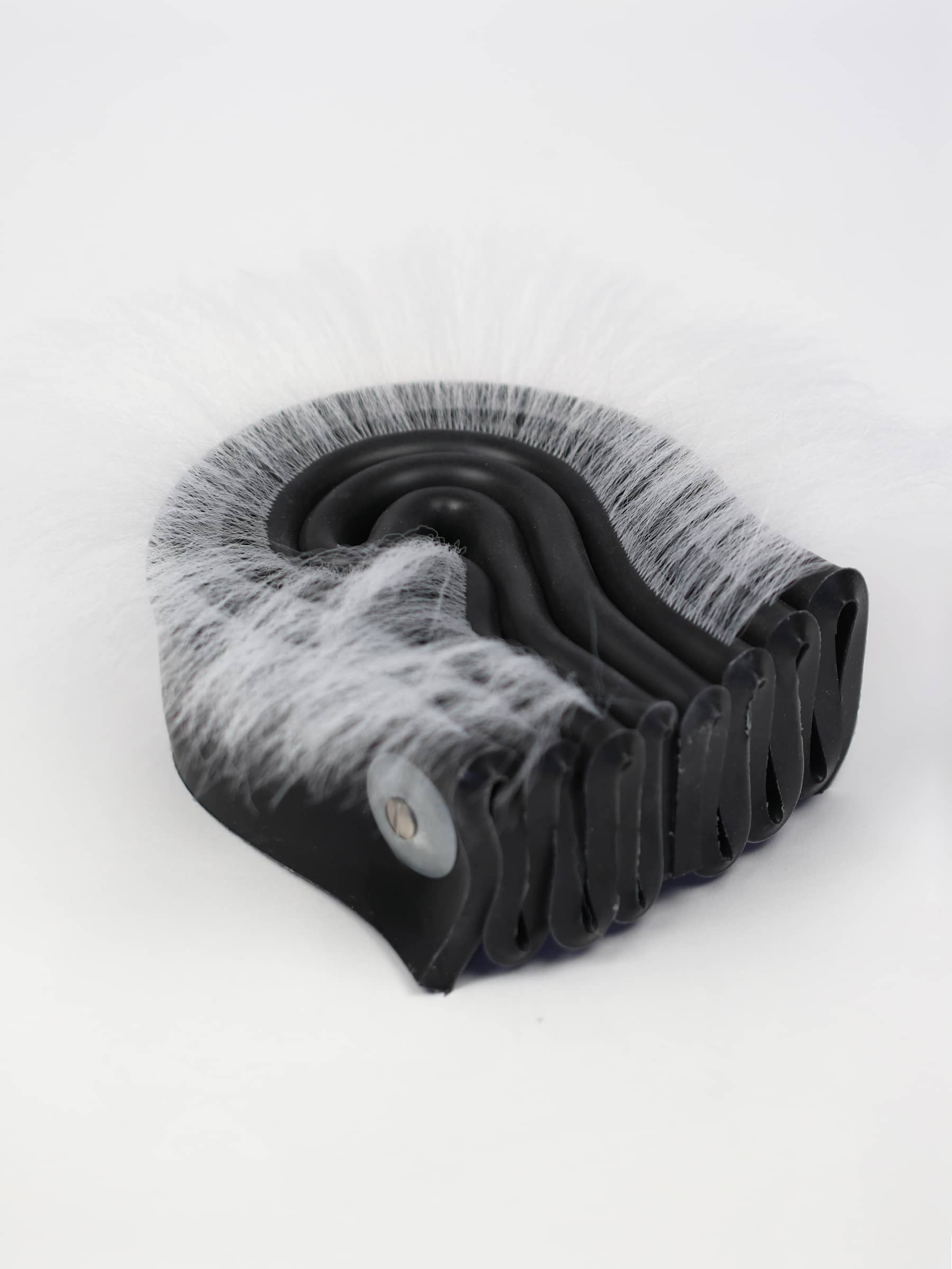 Silicone, synthetic hair, plastic, stainless steel hardware.