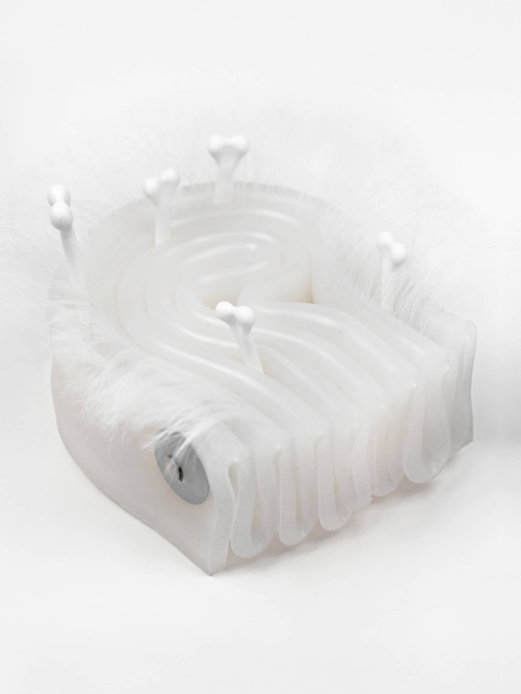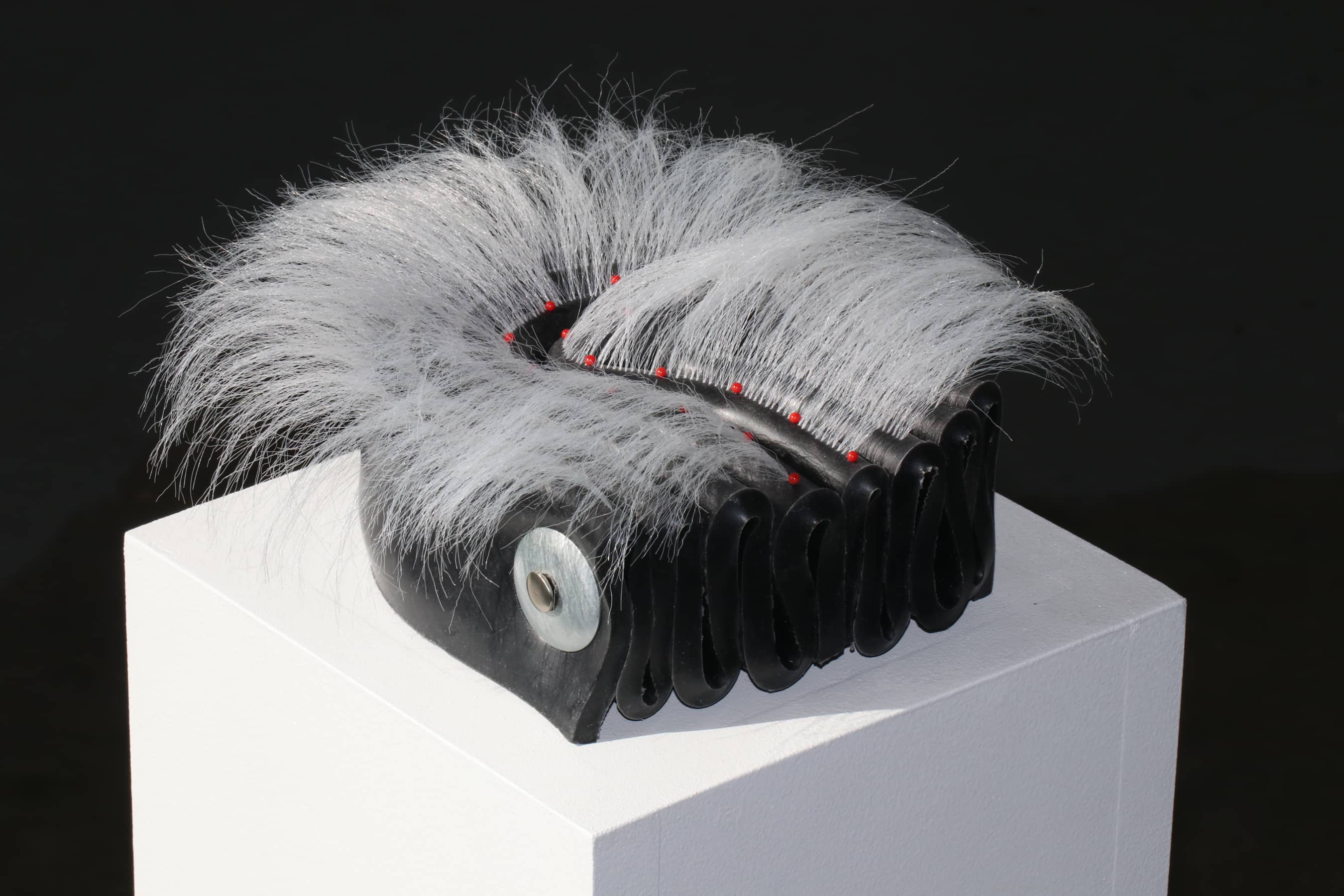 Silicone, pin with glass head, synthetic hair, stainless steel hardware.