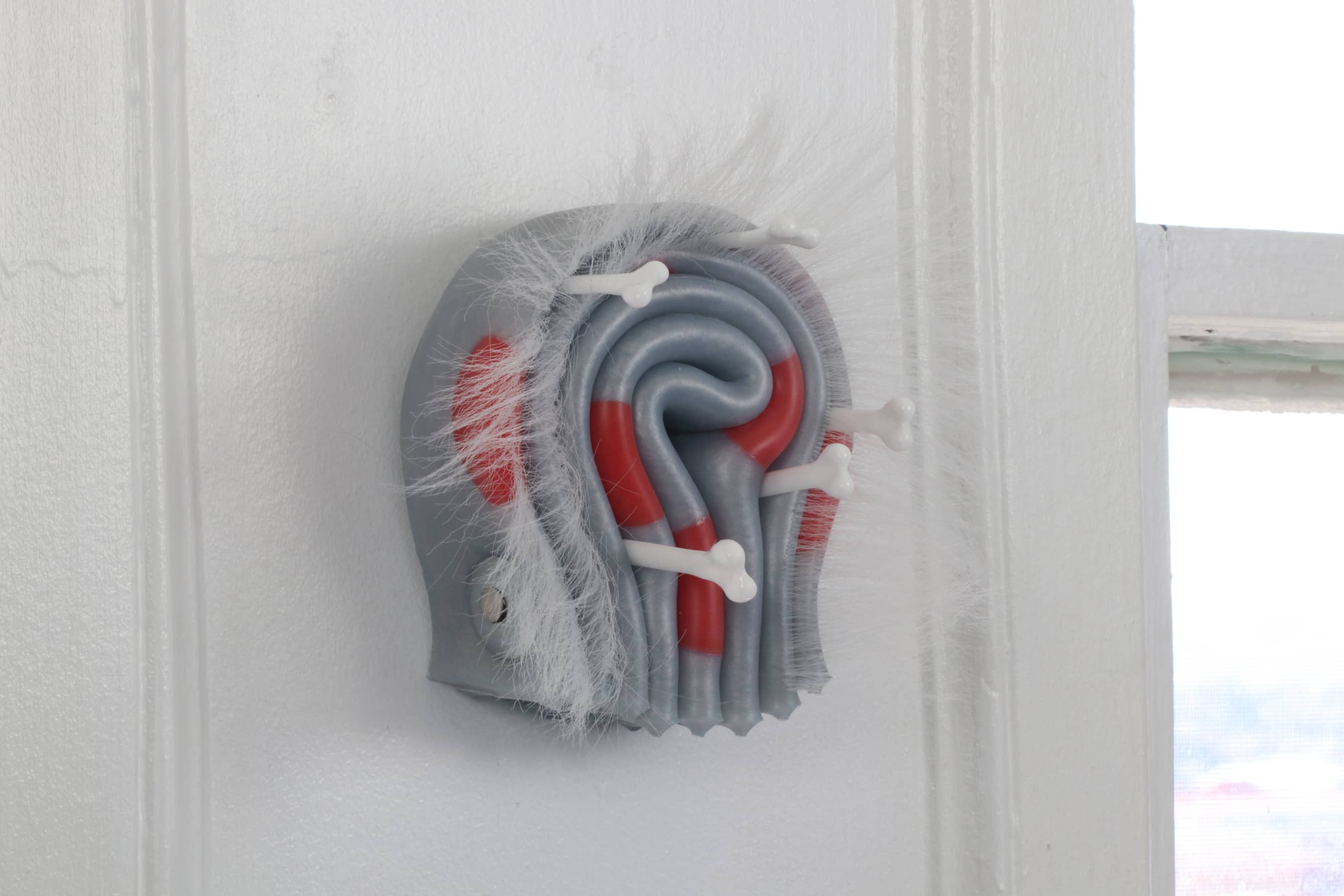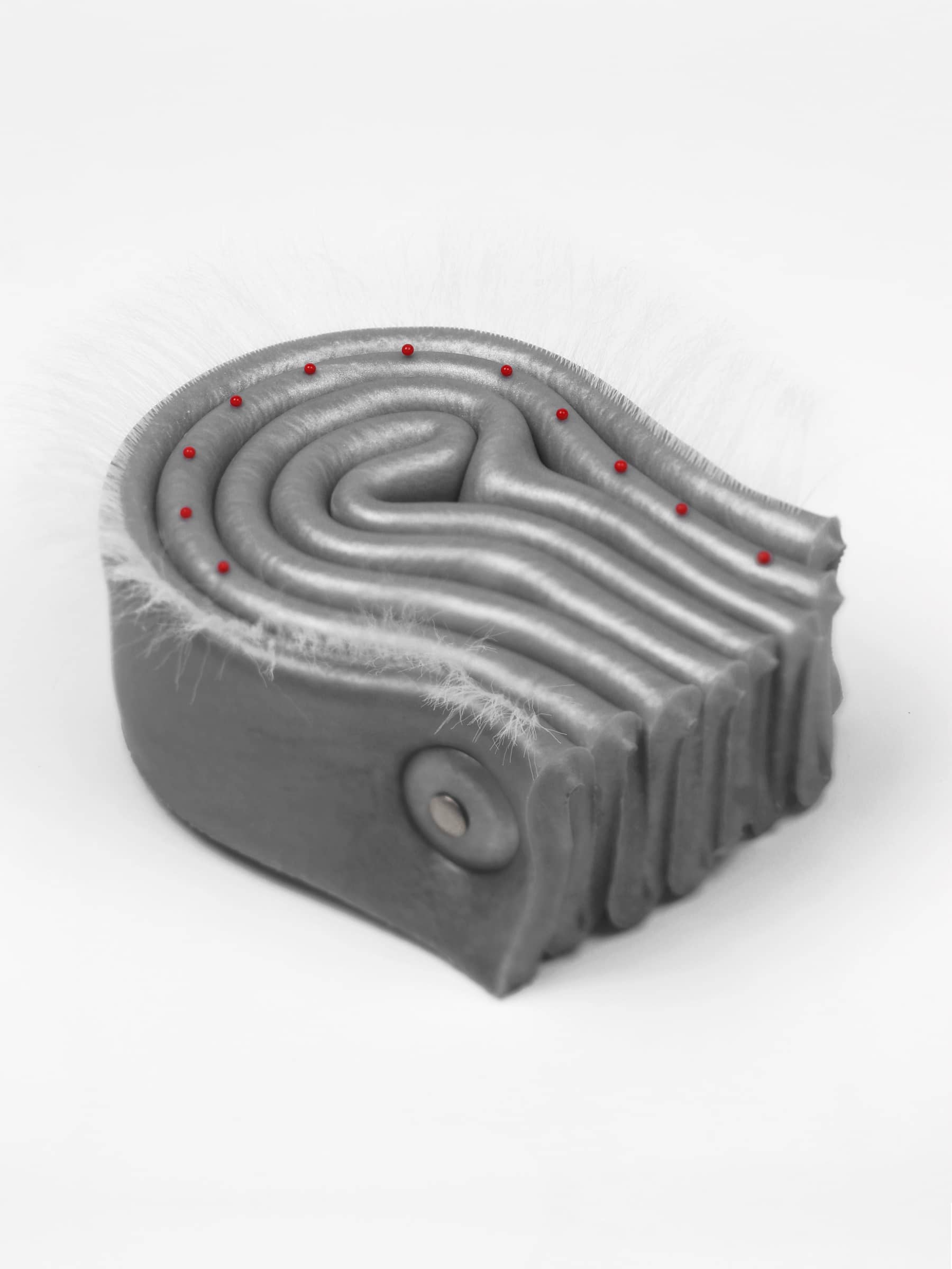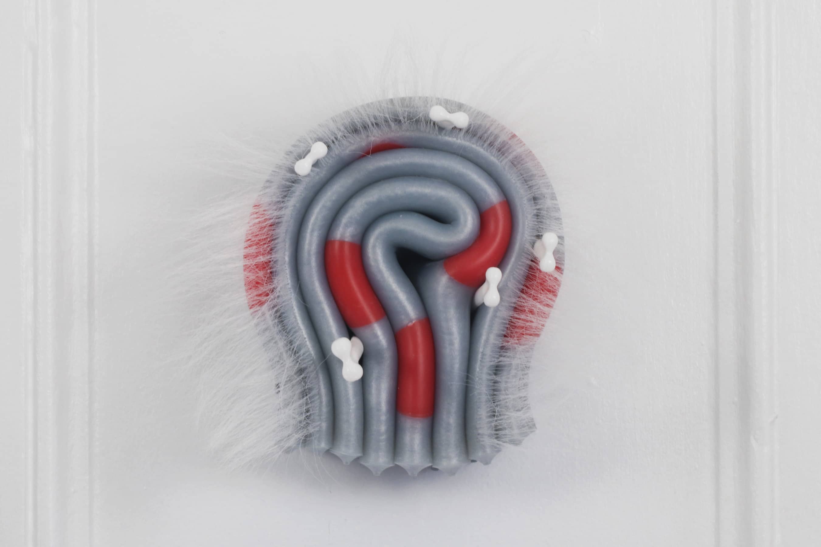 Silicone, synthetic hair, red pins with glass head, stainless steel hardware.