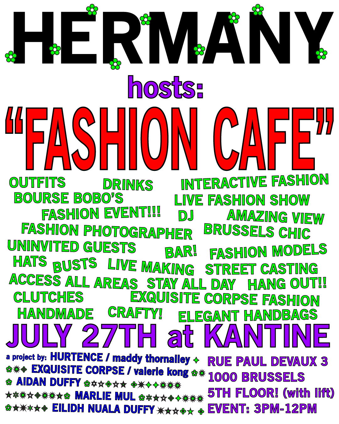 "FASHION CAFÉ" is a project by: HURTENCE / MADDY THORNALLEY, EXQUISITE CORPSE / VALERIE KONG, AIDAN DUFFY, MARLIE MUL, and EILIDH DUFFY